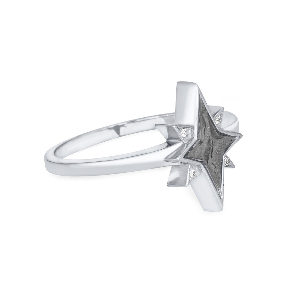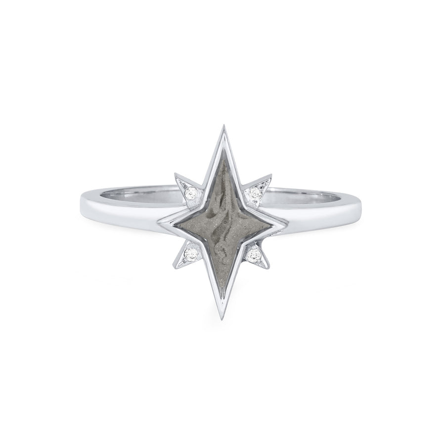 Your loved one's ashes are at the center of this beautiful 14k white gold north star ring, which is adorned with a single brilliant white diamond in each of its four points. A symbol of everlasting love and direction, we hope you will always feel your loved one's guiding light whenever you wear this ring.