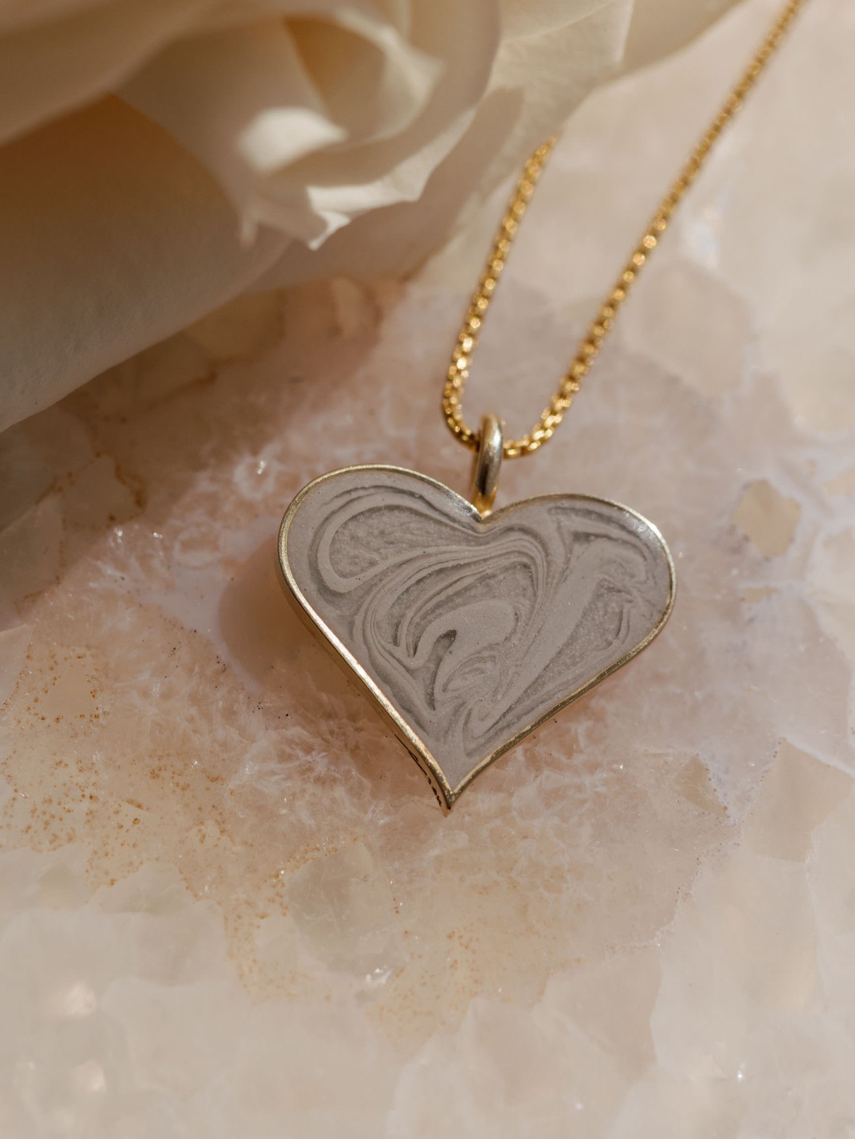 Show your endless love to the world with solidified ashes set into this 14k white gold heart pendant.