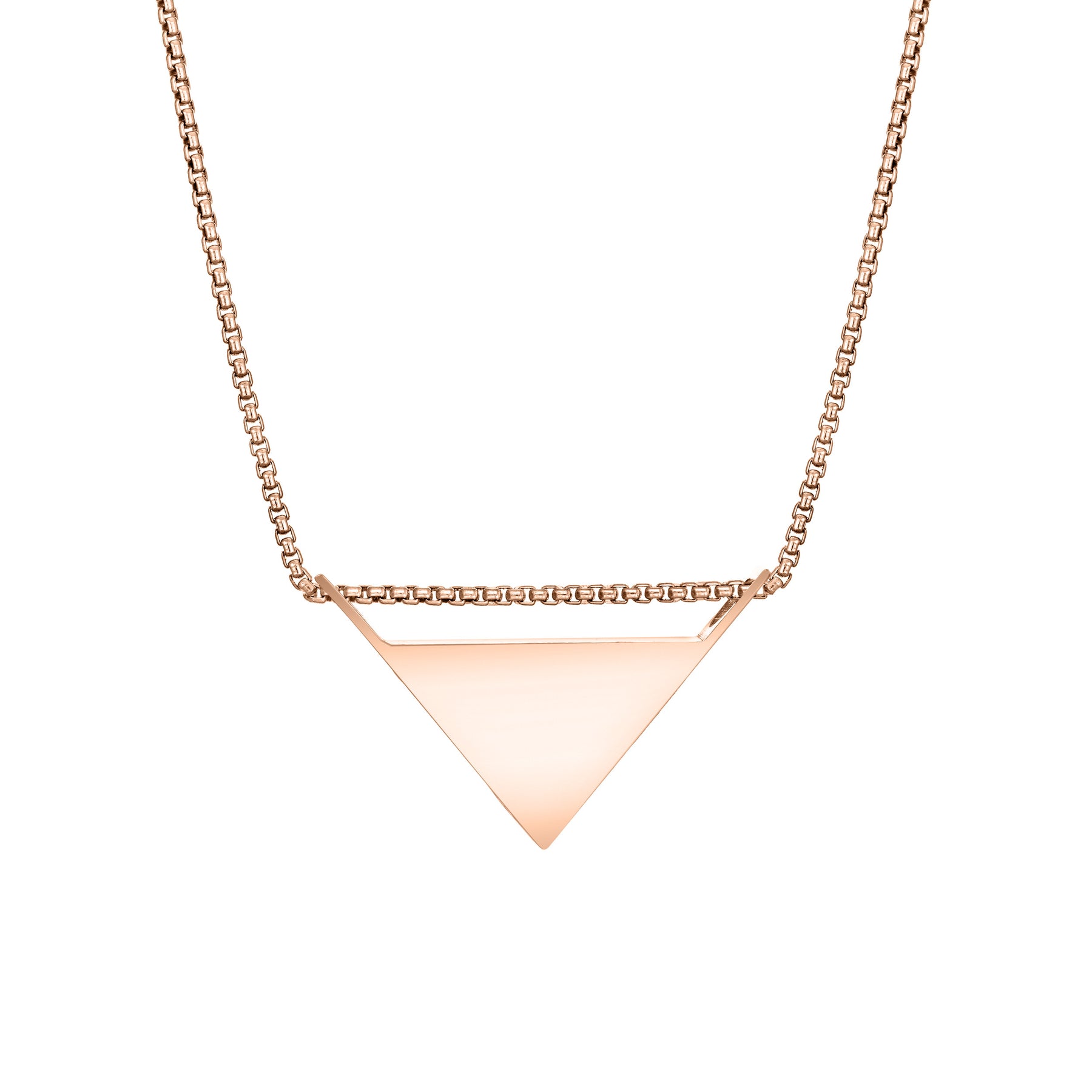 The detailed sliding triangle pendant is solid 14k rose gold, but comes with a 14/20 rose-gold-filled chain in the length of your choice from the options below. Information about matching solid 14k gold chains is available by request as well.