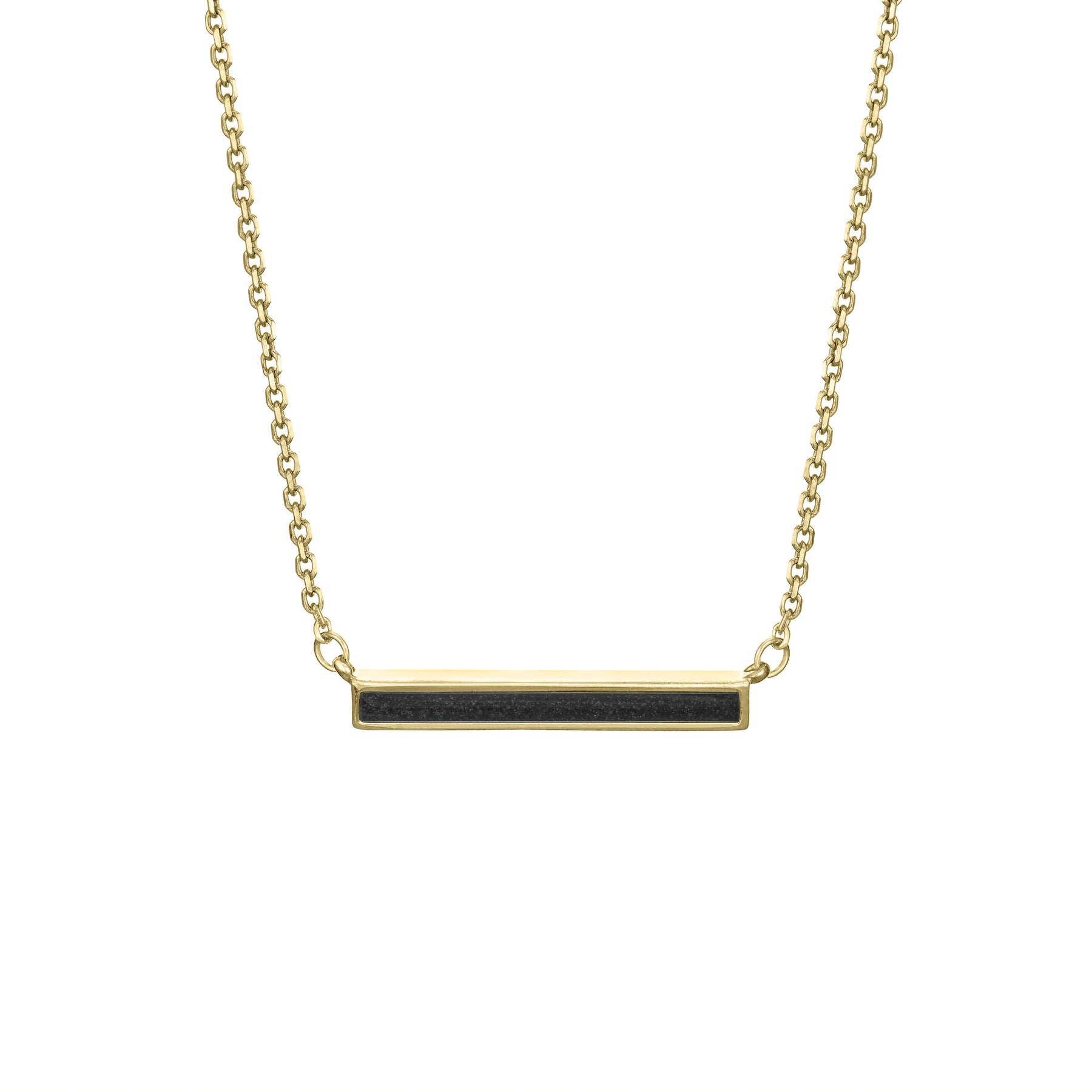 Discreet, elegant, and timeless, this 14k yellow gold cremation necklace features your loved one's ashes spanning the front of its sleek thin lateral bar component.