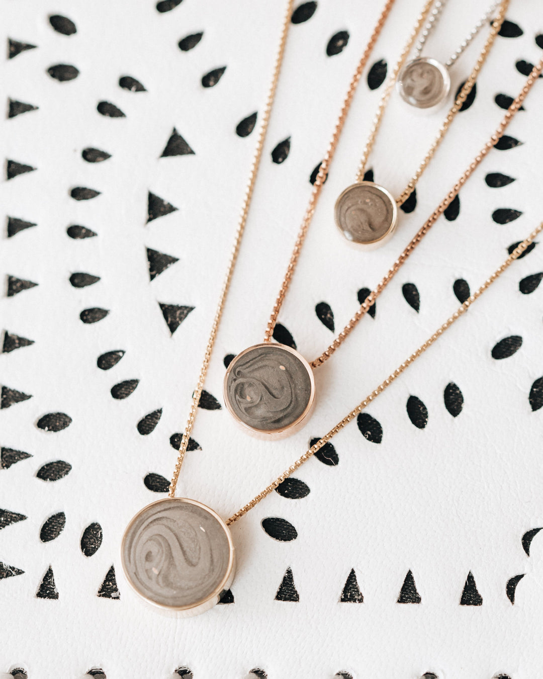 Please Note: The pendant featured in these photos was made with two separate sets of ashes, which produced differently colored settings. However, we cannot guarantee that multiple sets of ashes will produce drastically different-colored settings. No color is added to the ashes during the setting process to create a specific color or hue. If this pendant is made with only one set of ashes, the same color will be produced across both of the settings. Our multi-setting collection lists all of the pieces that can accommodate separately set ashes.