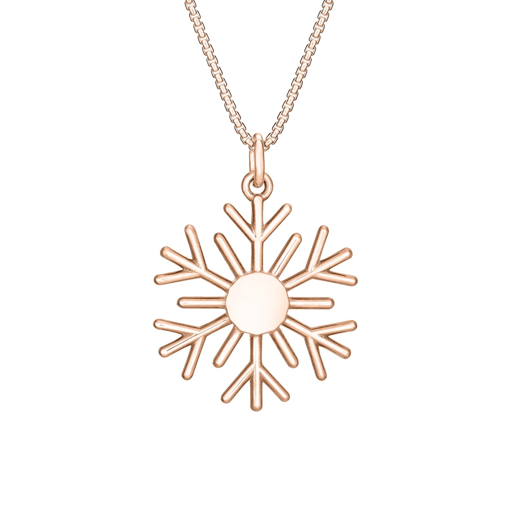 The snowflake pendant is solid 14k rose gold, but it is provided on a 14/20 rose gold-filled chain in the length of your choice. Information about matching solid 14k gold chains is available by request as well.