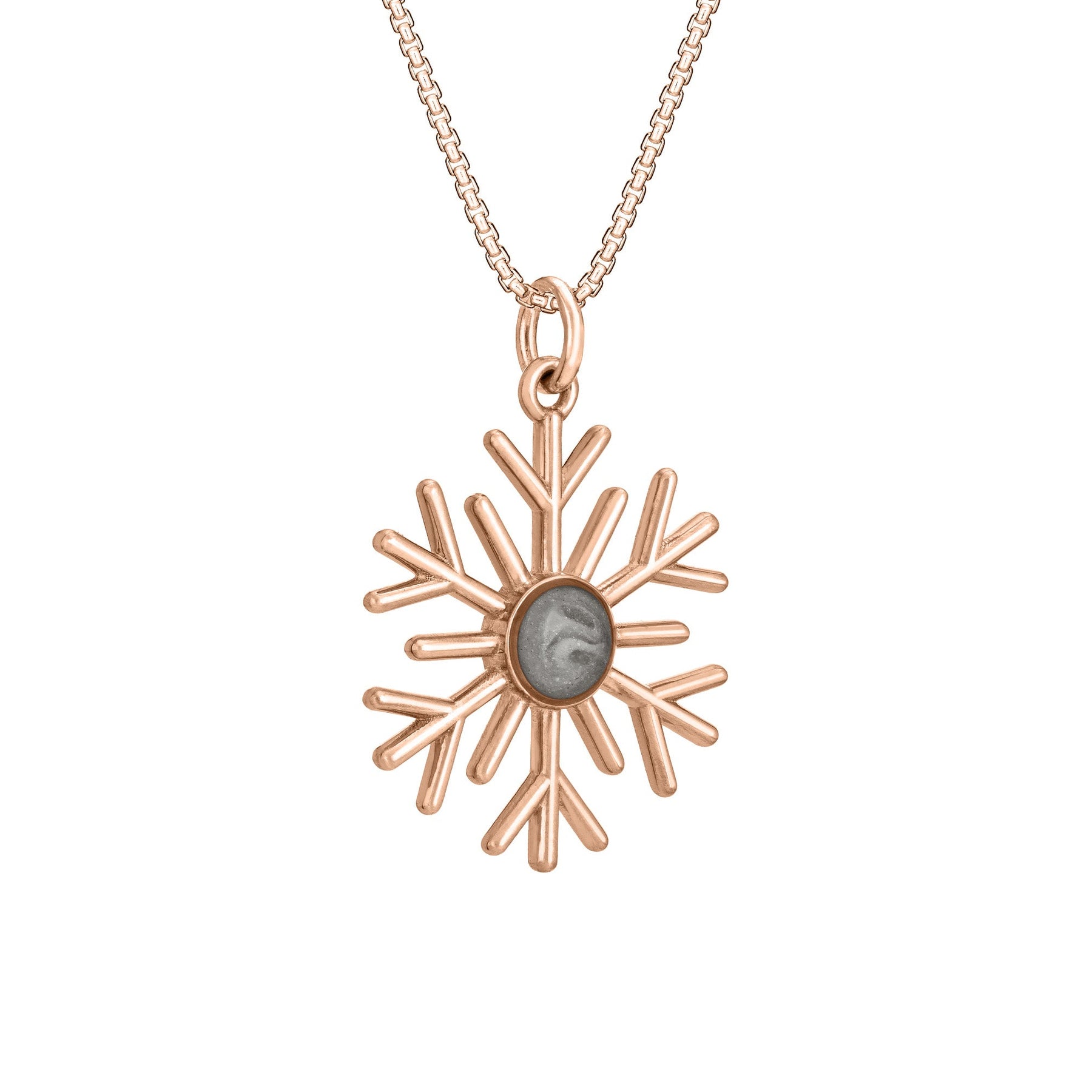 Like every snowflake, the love you shared was one of a kind. Honor your loved one’s memory with our snowflake cremation pendant in 14k rose gold—a symbol of winter’s delicate beauty, yet timeless enough to be cherished all year long. At the center of this classic silhouette rests a circular cremation setting carefully handcrafted with your loved one’s ashes to create a personal keepsake you can hold close every day.