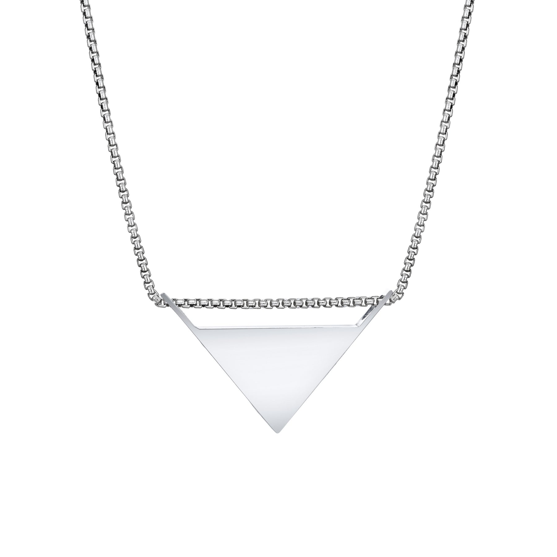 The detailed sliding triangle pendant is solid 14k white gold, but comes with a rhodium-plated sterling silver chain that can be clasped at either 16" or 18". Information about matching solid 14k gold chains is available by request as well.